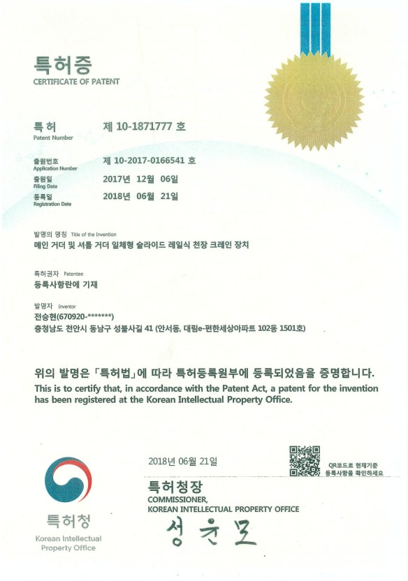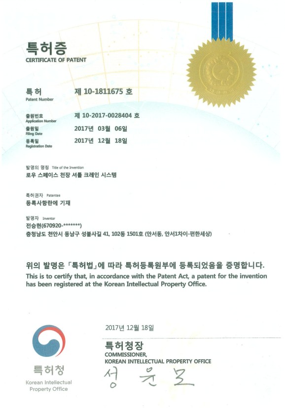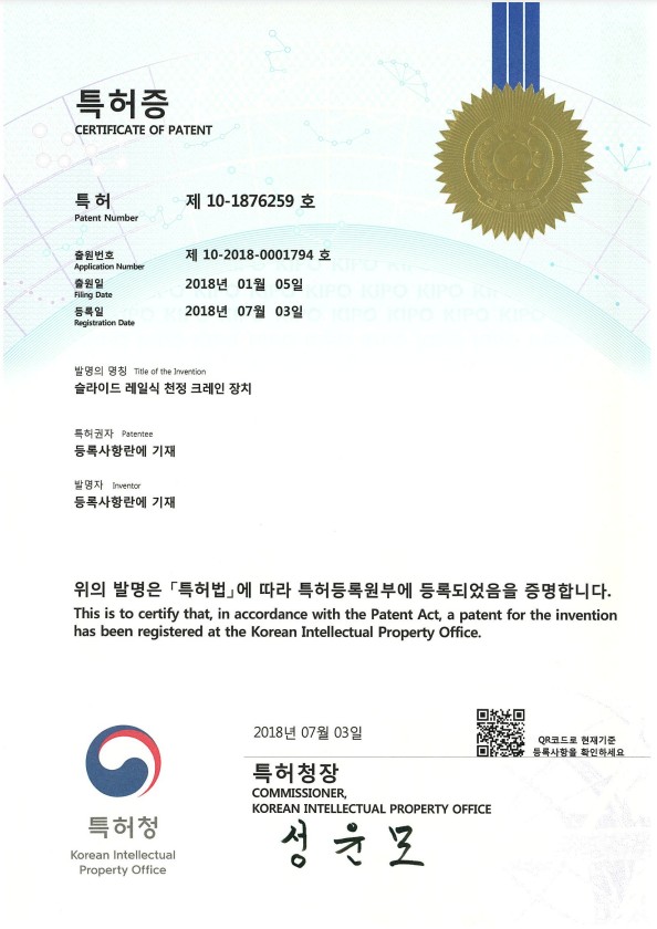 특허증 인증서 특허증 제 10-1876259호 슬라이드 레일식 천정 크레인 장치 특허증 제 10-1871777호 메인 거더 및 셔틀 거더 일체형 슬라이드 레일식 천장 크레인 장치 특허증 제 10-1811675호 로우 스페이스 천장 셔틀 크레인 시스템 1