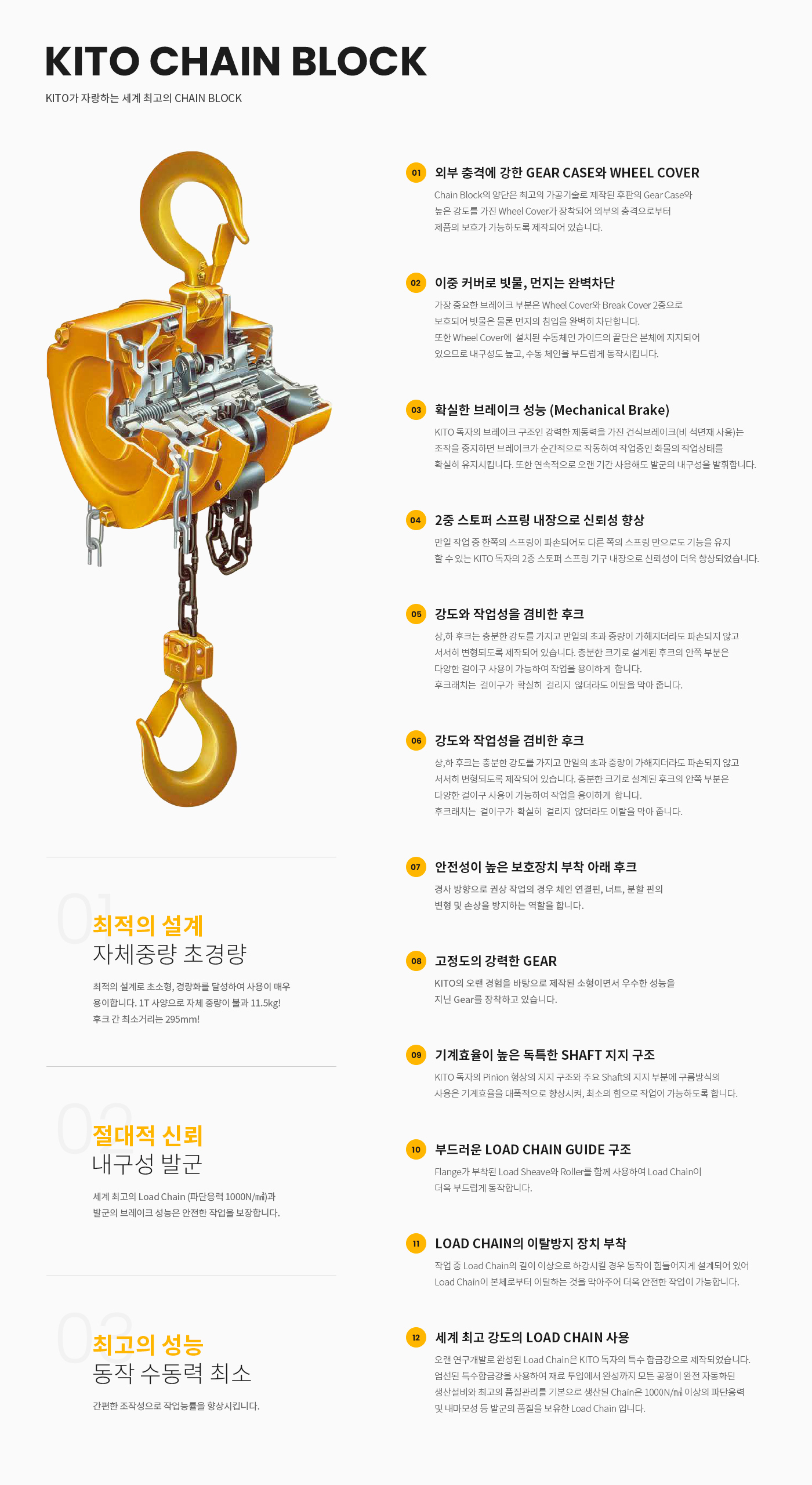 세계 최고의 Load Chain (파단응력 1000N/㎟)과 높은 브레이크 성능은 안전한 작업을 보장