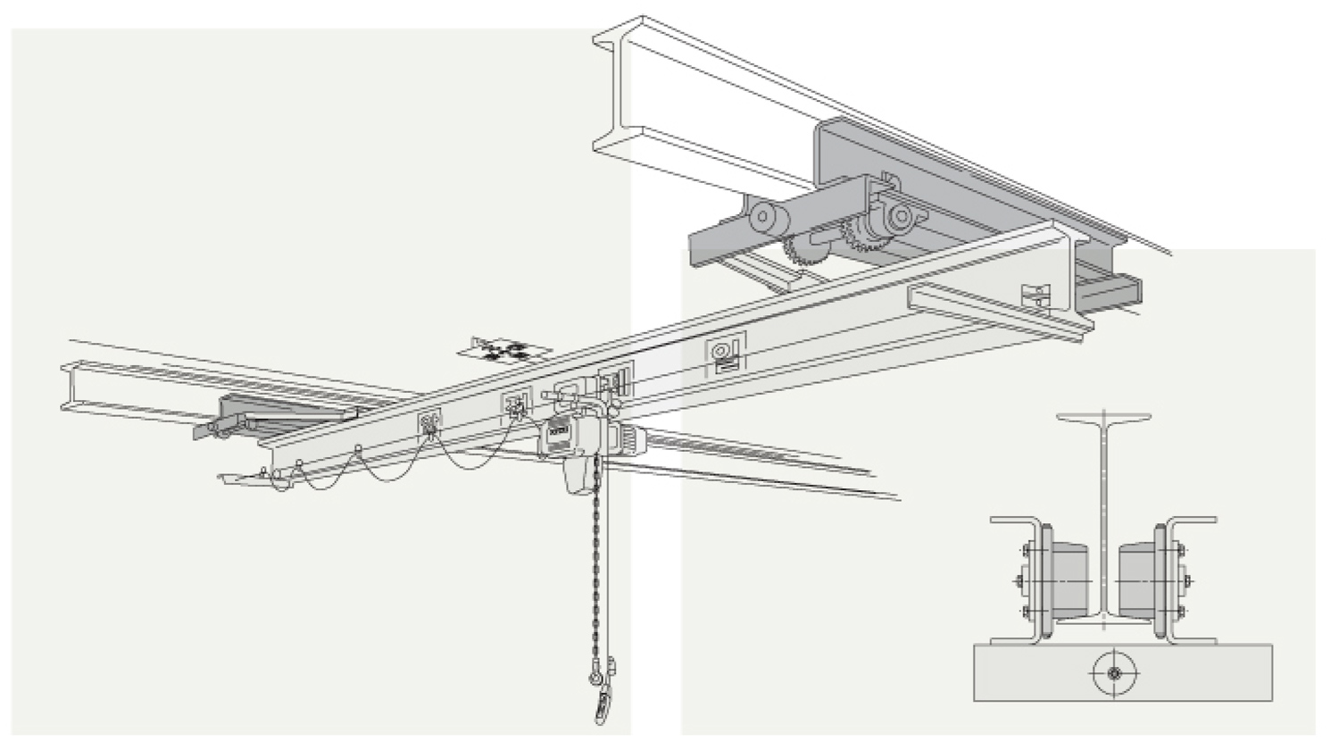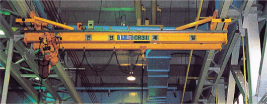 천장 크레인과 비슷한 성능과 기능을 발휘하며, 건물 천장 대들보에 주행레일을 고정하고 횡행용 거더를 설치하여 호이스트를 달아 사용하는 크레인입니다.